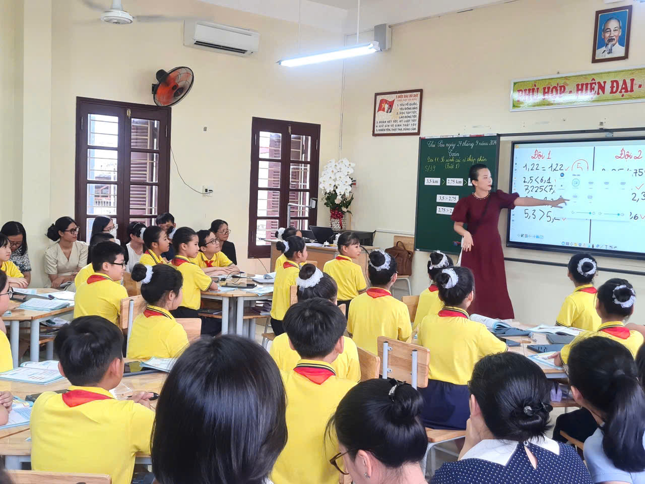 Tại chuyên đề đồng chí Chuyên môn nhà trường đã báo cáo về việc sử dụng các thiết bị phòng học Thông minh và sự cần thiết của công nghệ AI trong giáo dục, giúp giáo viên tạo ra các bài giảng sinh động hấp dẫn, quản lý lớp học dễ dàng, phát triển kỹ năng chuyên môn … nâng cao hiệu quả giảng dạy. Các đồng chí đại biểu được dự tiết dạy minh họa môn Toán, Bài 11: So sánh các số thập phân (Tiết 1) do cô giáo Trần Minh Thu và các em học sinh lớp 5A7 trường Tiểu học Đông Hải 1 thực hiện.