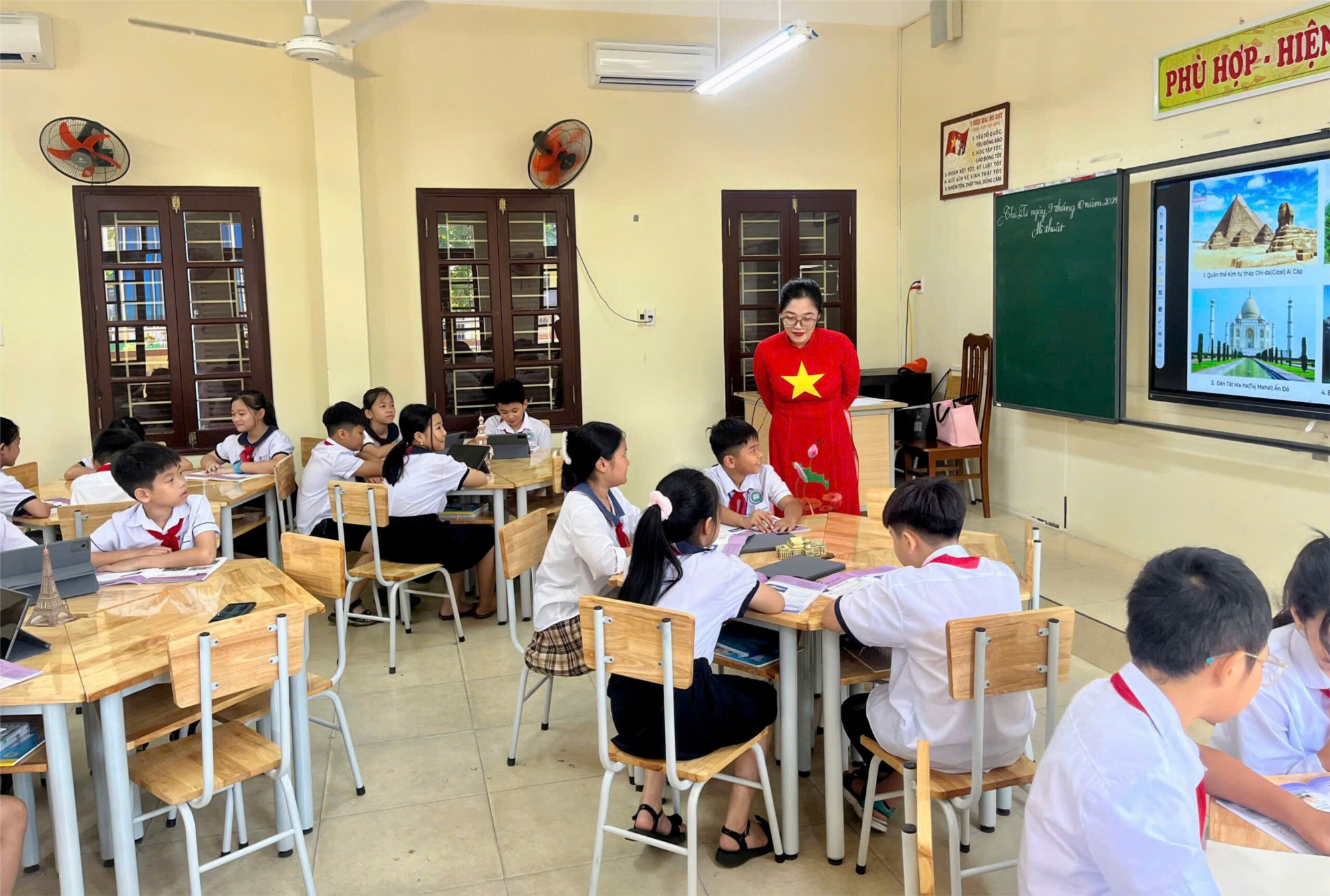 Tiết dạy mở đầu hội thi được thực hiện tại Phòng học thông minh, ứng dụng phần mềm AI trong giảng dạy môn Mĩ thuật do cô giáo Phạm Thị Quỳnh Anh và các em học sinh lớp 5A1 thực hiện. Bài: Cảnh quan thế giới (tiết1). Bằng cách sử dụng thành thạo các thiết bị thông minh, bảng tương tác, phần mềm dạy học, cô giáo đã rất thành công trong tiết học của mình. Cô giáo đã ứng dụng linh hoạt công nghệ của phần mềm trong tiết học để giới thiệu cho học sinh những kì quan nổi tiếng của thế giới thông qua hoạt động khám phá, năng lực sử dụng công nghệ, khả năng sáng tạo của học sinh được phát triển.