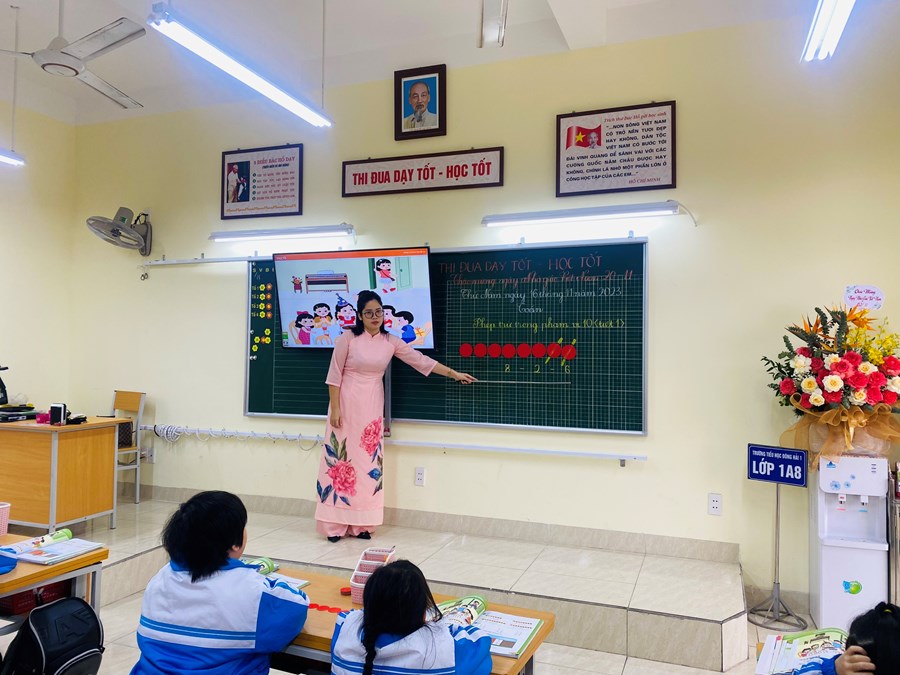 Hướng tới kỷ niệm 41 năm Ngày Nhà giáo Việt Nam 20/11 (1982-2023), trường Tiểu học Đông Hải 1 đã tổ chức nhiều hoạt động và phong trào thi đua thiết thực để chào đón ngày lễ trọng đại này. Qua đó, tạo khí thế hăng hái, phấn đấu trong dạy và học, góp phần nâng cao chất lượng giáo dục. Đồng thời, giúp học sinh nhớ về truyền thống “Tôn sư trọng đạo”, tỏ lòng biết ơn các thầy, cô giáo đang ngày đêm đóng góp trí tuệ, cống hiến cho sự nghiệp “trồng người”, giáo dục thế hệ trẻ. Hòa trong không khí đó, ngày 16/11/2023 cô giáo Nguyễn Thị Hải Vân lớp 1A8 đã lên lớp thành công tiết dạy tốt : Phép trừ trong phạm vi 10 – Tiết 1. Tiết dạy đã vận dụng linh hoạt các phương pháp và hình thức tổ chức dạy dọc làm cho học sinh vô cùng hứng thú với các hoạt động dạy và học.