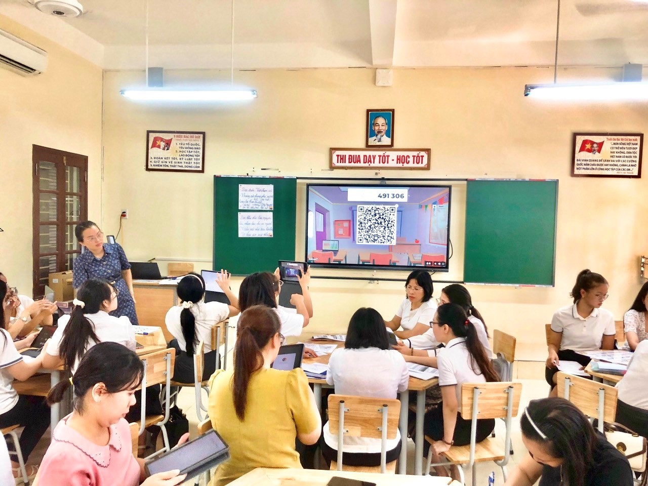 Sau giờ dạy, tổ chuyên môn đã rút kinh nghiệm tiết dạy, áp dụng tiết học vào thực tế sao cho đạt hiệu quả và phát huy được năng lực, phẩm chất cho học sinh; khai thác tối đa các thiết bị thông minh. Dưới đây là một số hình ảnh minh hoạ tiết dạy:
