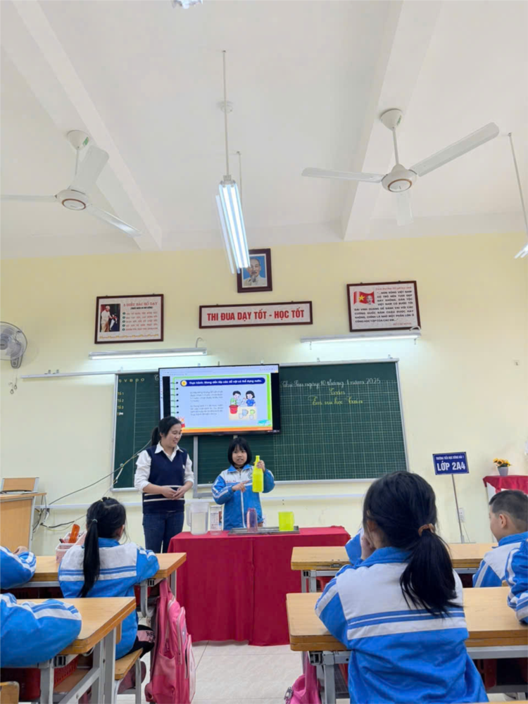 Phần lên lớp minh họa do cô giáo Nguyễn Thị Hoài và các em học sinh lớp 2A4 thể hiện. Trong tiết học, các em được thực hành cân đo cân nặng của các bạn. Các em cũng chỉ ra được các dụng cụ chứa được 1 lít, các dụng cụ chứa nhiều hơn hay ít hơn 1 lít và vận dụng vào thực tế cuộc sống. Tiết học đã diễn ra rất sôi nổi và thành công, đạt được mục tiêu của chuyên đề.