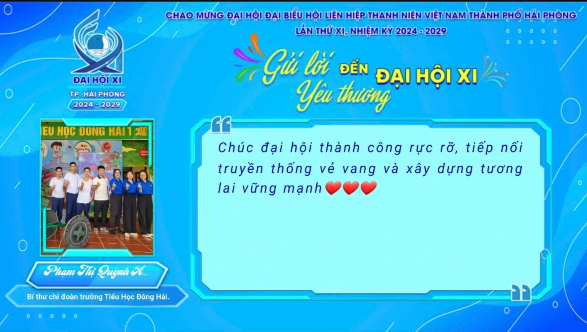 Qua những lời chúc, lời nhắn gửi đầy yêu thương và tin tưởng, tập thể giáo viên đoàn viên trường Tiểu Học Đông Hải 1 gửi gắm niềm tin vào sự thành công của Đại hội Đại biểu Hội Liên hiệp Thanh niên Việt Nam thành phố Hải Phòng. Chúc Đại hội thành công rực rỡ. Chúc thành phố Hải Phòng sẽ luôn đi đầu thực hiện những nhiệm vụ được Nhà nước giao phó.