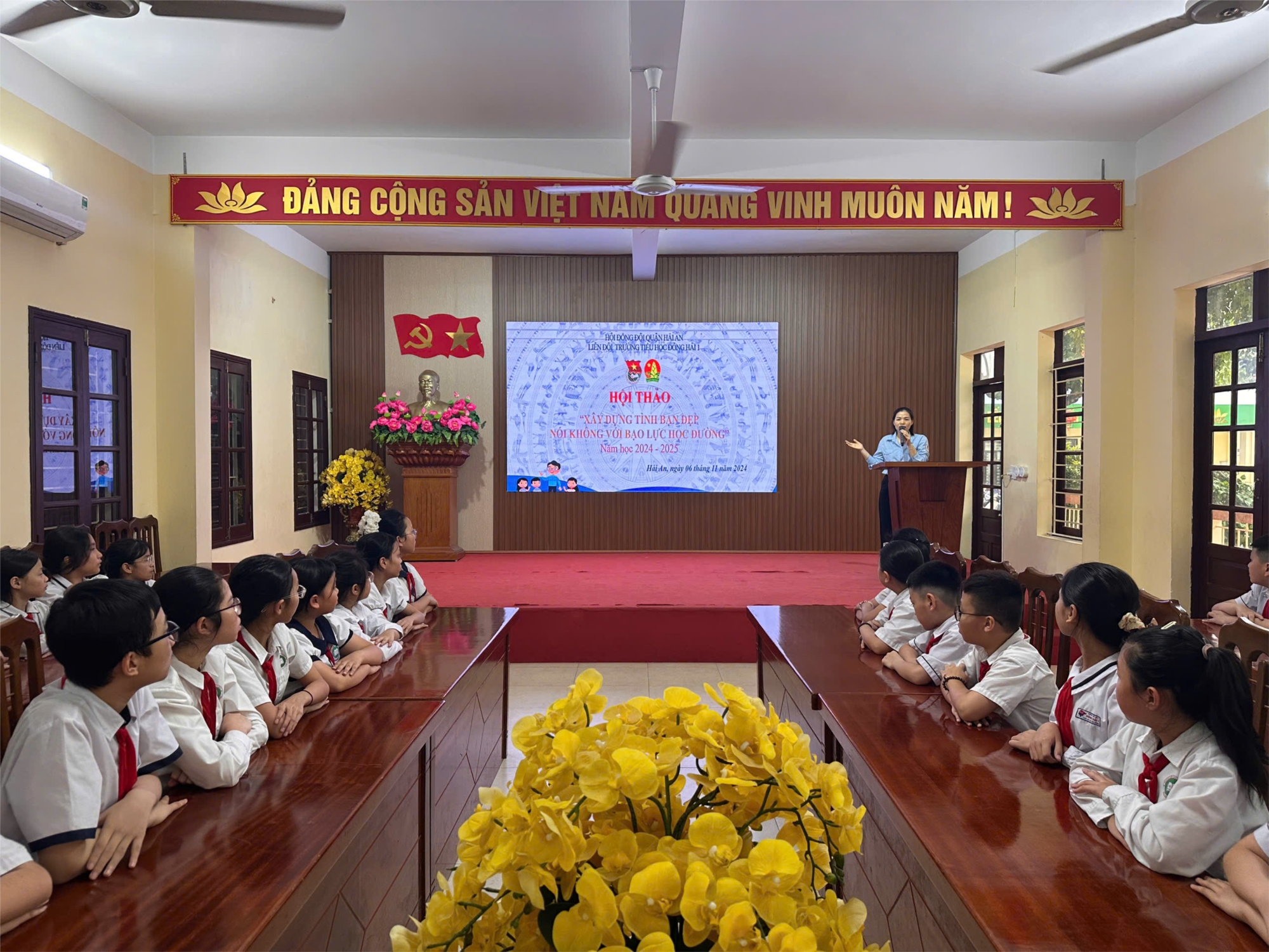 Chính vì lẽ đó, sáng ngày 06 tháng 11 năm 2024, liên đội trường TH Đông Hải 1 tổ chức hội thảo "Xây dựng tình bạn đẹp - Nói không với bạo lực học đường". Trong buổi hội thảo, cô giáo Nguyễn Thị Kim Huế - Giáo viên TPT đã đưa ra những trò chơi, hoạt động vui nhộn nhằm tạo các mối quan hệ đoàn kết, yêu thương bạn bè đến với học sinh. Ngoài ra, thầy còn chia sẻ với học sinh những câu chuyện hay về tình bạn, những điều cần làm để xây dựng tình bạn đẹp. Hội thảo đã thu hút sự chú ý của học sinh, giúp buổi chuyên đề vừa nhẹ nhàng nhưng lại tạo được hiệu quả giáo dục cao.
