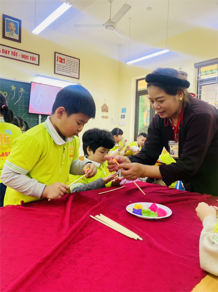 Tham gia nặn tò he, trẻ sẽ được rèn luyện tính sáng tạo, sự kiên trì, tỉ mỉ. Đặc biệt, trò chơi này còn giúp bé vun đắp tình yêu quê hương đất nước và lòng tự hào về bản sắc văn học của dân tộc. Được sự hướng dẫn của bác Tám - nghệ nhân nặn Tò he ( chim cò) của Hải Phòng các em HS đã được tham gia trải nghiệm nặn những bông hoa để tặng Bà, tặng mẹ và các cô.