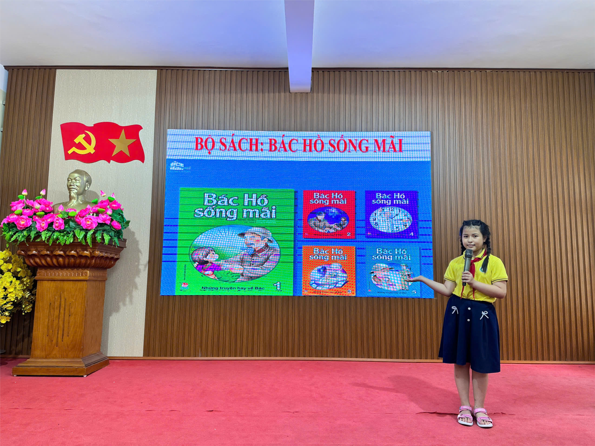 Tại buổi sinh hoạt, các em học sinh được lắng nghe phần giới thiệu bộ sách “Bác Hồ sống mãi” của nhà xuất bản Kim Đồng.Bộ sách gồm những câu chuyện bình dị về Bác được sưu tầm từ các nguồn sách, báo, tạp chí,... Truyện được kể ngắn ngọn, súc tích cùng những hình ảnh minh họa sinh động, sáng tạo. Hai mươi câu chuyện về Bác được xuất bản thành bộ 5 cuốn, mỗi cuốn gồm 4 câu chuyện nhỏ dung dị thường ngày, mà vẫn thể hiện được tầm vóc nhân cách lớn của Bác.