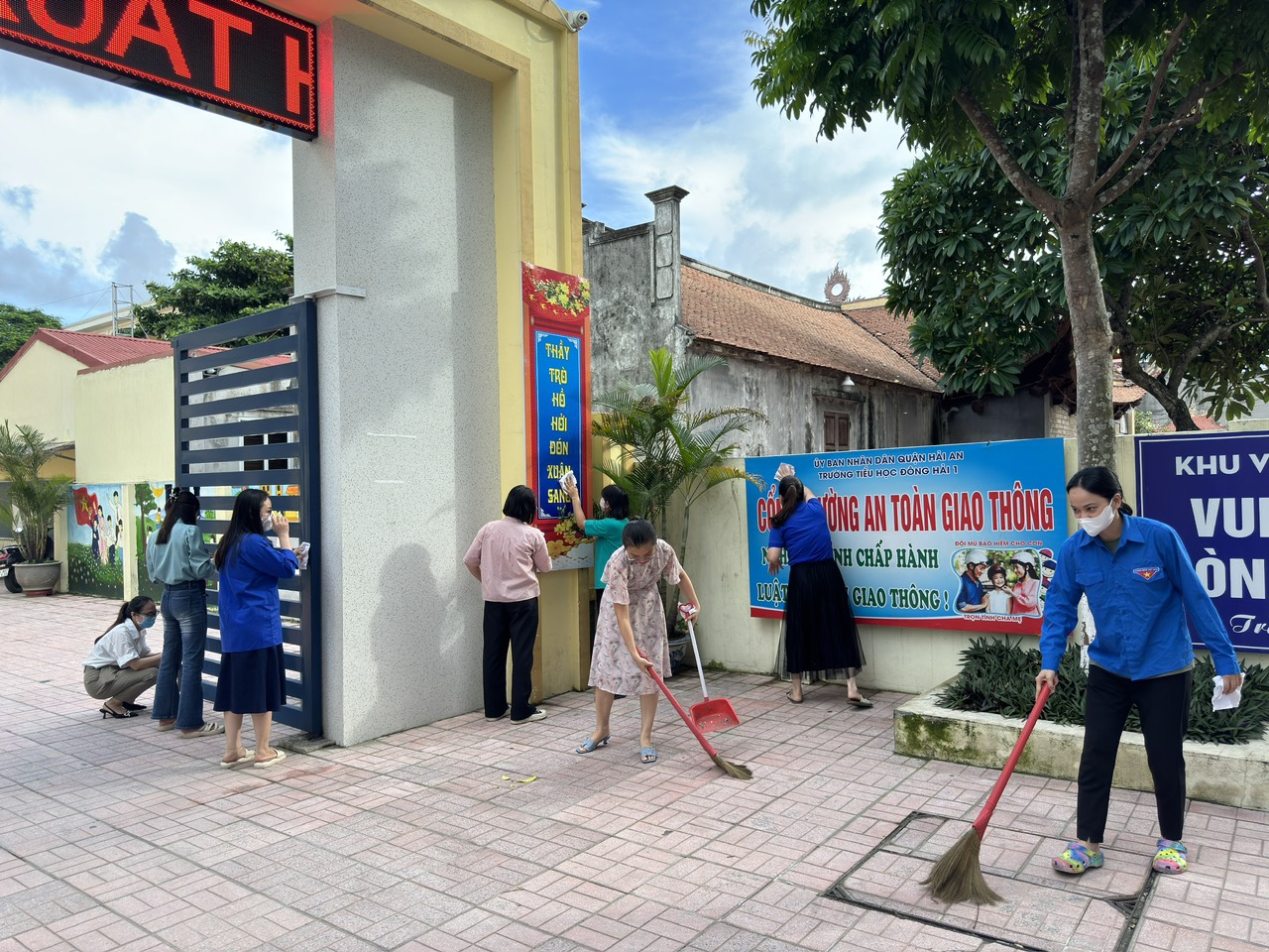 Các đoàn viên Trường tiểu học Đông Hải 1 tham gia “Chủ nhật xanh” đã tập trung dọn dẹp, thu gom rác khu vực sân chính và khu vực xung quanh trường, cắt tỉa cây xanh.
